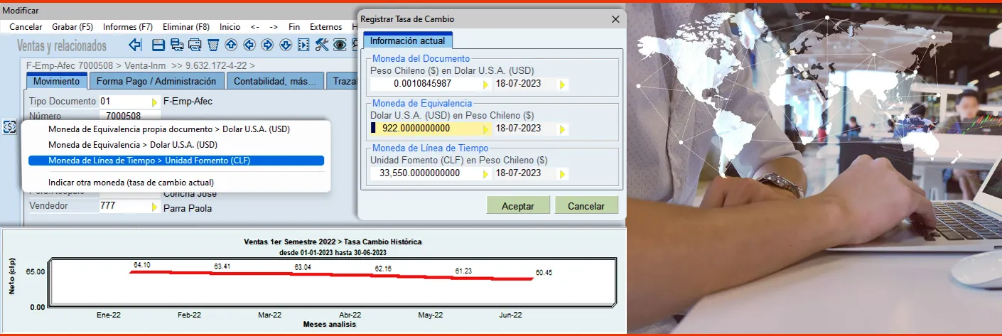 Aproveche las tasas de cambio Históricas para considerar en sus estadísticas y proyecciones la reajustabilidad o la inflación en la línea de tiempo, y para cumplir las exigencias contables y legales respecto a las importaciones, exportaciones y costo fiscal de inventario, además del costo interno y el costo de venta de este.