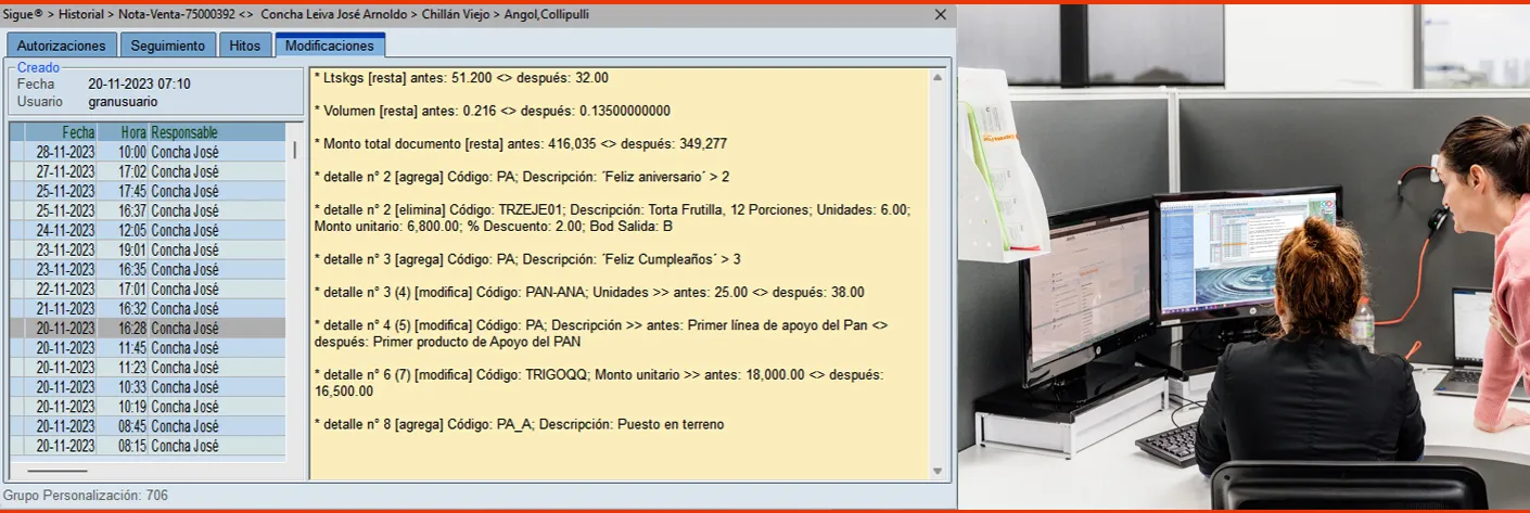 Muy útil, por ejemplo, ante dudas de porqué se autorizó o bloqueó una venta; o sobre un seguimiento que no se concretó adecuadamente; o respecto a los hitos de los que el ERP puede dejar registro, tales como la gestión de bodega, el despacho de mercadería, la entrega en terreno y otros; o sobre las modificaciones hechas al registro, donde queda constancia detallada del antes y el después de cada cambio.